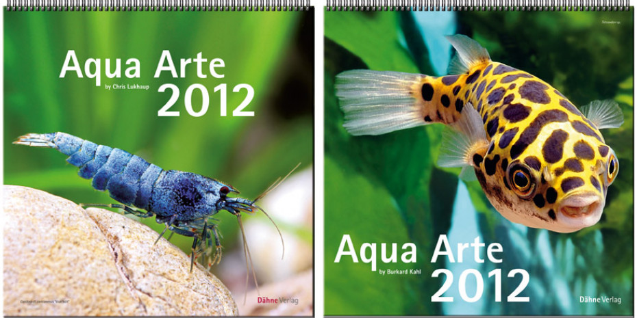 Zwei Wandkalender mit Aquaristik-Motiven sind neu im Dähne Verlag erschienen. Die Kalender mit einer Größe von 297 x 297 mm sind mit einer hochwertigen Spiralbindung versehen und das internationale Kalendarium macht diesen Wandschmuck vielseitig einsetzbar. So zeigt der Kalender „Aqua Arte 2012 by Burkard Kahl” (ISBN 978-3-935175-80-7) in besonderen Fotos Aquarienfische in bestechenden Ansichten. Chris Lukhaup wiederum vermittelt dem Betrachter seines Kalenders „Aqua Arte 2012 by Chris Lukhaup“ (ISBN 978-3-935175-81-4) spektakuläre Bilder von Garnelen, Schnecken, Krebsen und Krabben.www.daehne.de