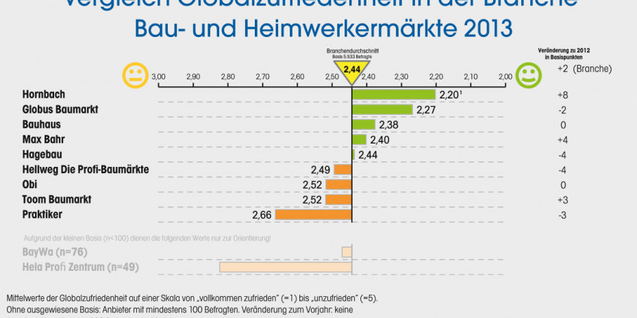 Beim Kundenmonitor Deutschland 2013 erreichen in puncto Qualitätsbeurteilung aus Kundensicht Lebensmittel- und Drogeriemärkte, Krankenkassen, Kreditinstitute, Postfilialen sowie die Kundendienste der Haushaltsgroßgeräte in den Branchenwerten ein neues Allzeithoch. Das sind zentrale Ergebnisse der branchenübergreifenden Studie Kundenmonitor Deutschland 2013, die von der Service Barometer AG in München vorgestellt wurde. Für die Studie wurden bundesweit fast 38.000 Verbraucher befragt. Das Gesamturteil ergibt sich aus der Frage „Wie zufrieden sind Sie mit Ihrem hauptsächlich genutzten Anbieter insgesamt?“ und wird auf einer Skala von „vollkommen zufrieden“ (=1) bis „unzufrieden“ (=5) gemessen.Von den untersuchten Handelsbranchen heben sich neben den stabilen Werten bei Lebensmittelmärkten (+1 Basispunkt) und Baumärkten (+2 Basispunkte) besonders die Drogeriemärkte durch wiederholt steigende Werte hervor. So kann sich die Baumarktbranche im Kundenurteil leicht verbessern und erzielt eine Zufriedenheitsnote von 2,44 (Vorjahr 2,46). Im Detail lassen sich signifikante Steigerungen der Kundenzufriedenheit bei Erreichbarkeit (2,32), Sonderangebotsaktionen (2,59) und Wartezeit an der Kasse (2,64) nachweisen. Bei Mitarbeiterfreundlichkeit (2,45), fachliche Beratung (2,58) und Qualität der Waren (2,46) wird jeweils der beste Zufriedenheitswert der letzten 20 Jahre erzielt. Im Einzelaspekt Umweltorientierung kann die Baumarktbranche zwar ebenfalls zulegen, allerdings bleibt das Zufriedenheitsniveau hier nach wie vor sehr niedrig (2,76). Besonders auffällig ist der deutliche Anstieg der Beschwerdezufriedenheit von 2,32 auf 2,16 in diesem Jahr. Die Verfügbarkeit von Ansprechpartnern wird von den Baumarktkunden jedoch unverändert kritisch wahrgenommen (3,00).Im Anbietervergleich setzt sich beim diesjährigen Kundenmonitor Hornbach durch. Mit einem signifikanten Plus im Vergleich zu 2012 erzielt die in der Pfalz ansässige Baumarktkette mit einem Zufriedenheitswert von 2,20 eine neue Branchenbestmarke. Hornbach kam bei den insgesamt 35 Bewertungskategorien 19 Mal Platz auf eins und acht Mal auf Platz zwei. Der Vorjahressieger Globus Baumarkt verliert in der Globalzufriedenheit leicht und rutscht damit auf den zweiten Platz. Die mittlerweile im Insolvenzverfahren befindlichen Max Bahr-Baumärkte rangieren in der Kundengunst mit einem Mittelwert von 2,40 auf Rang 4, knapp hinter dem Drittplatzierten Bauhaus (2,38).Die Onlineshops der großen Baumarktketten erreichen 2013 einen…