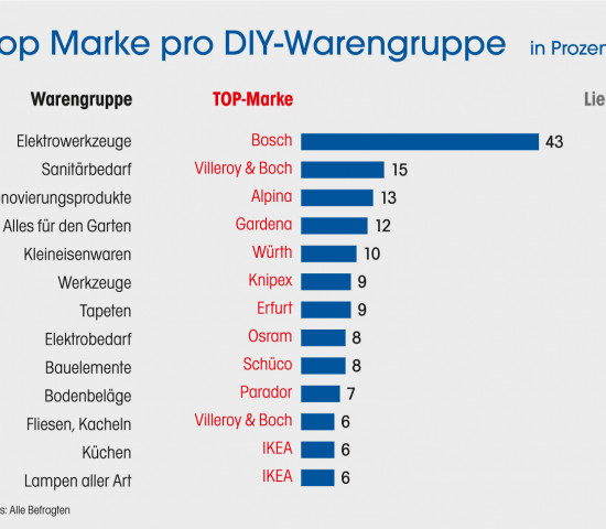 Bei der aktuellen Baumarktstudie von Konzept & Markt und Dähne Verlag standen die Handwerker und deren Verhältnis zu den Baumärkten im Fokus (siehe diy 5/2013). Bei den Produkten und Warengruppen, die im DIY-Bereich angeboten werden, fällt es relativ schwer, von Dingen zu sprechen, die die Nutzer (egal ob Profi oder Laie) „emotional“ berühren. Trotzdem ist es durchaus vorstellbar, dass man mit einem bestimmten Produkt besonders gerne arbeitet bzw. ein bestimmtes Produkt besonders gerne verarbeitet. Deshalb haben sich die Initiatoren der Studie entschlossen nachzufragen, ob es bei den Handwerkern „Lieblingsmarken“ gibt, die diese Zielgruppe besonders ansprechen. Da das Thema Marke im DIY-Bereich bei weitem nicht so intensiv gespielt wird, wie zum Beispiel bei den Lebensmitteln oder Drogerieartikeln, verwundert es nicht, wenn bei einer ganzen Reihe von Baumarktwarengruppen die befragten Handwerker keine Lieblingsmarke nennen konnten oder wollten. Während bei der Warengruppe „Elektrowerkzeuge“ dieser Anteil an Befragten 22 Prozent beträgt, liegt dieser Anteil bei Tapeten, Fliesen/Kacheln und Lampen aller Art bei 68 Prozent. Es gibt allerdings eine Marke, die sich ganz eindeutig als Lieblingsmarke der befragten Handwerker profilieren kann, das ist die Marke Bosch im Bereich der Elektrowerkzeuge mit 43 Prozent der Nennungen. Mit großem Abstand folgen Villeroy & Boch (15 Prozent, Sanitärbedarf), Alpina (13 Prozent, Farben/Lacke), Gardena (zwölf Prozent, Alles für den Garten) und Würth (zehn Prozent, Kleineisenwaren). Um zu überprüfen, ob das Label „Made in Germany“ auch bei den Handwerkern Beachtung und Aufmerksamkeit findet, würde bei dieser Gruppe nachgefragt, welche Meinungen und Einstellungen aus deren Sicht zu diesem „Qualitätslabel“ bestehen. Knapp der Hälfte der 1.000 befragten Handwerker wäre es schon wichtig, dass die Produkte, die sie aus dem DIY-Bereich kaufen, den Hinweis „Made in Germany“ aufweisen. Jeder zweite Handwerker zieht Produkte, die in Deutschland hergestellt werden, ausländischen Produkten vor. Und für 60 Prozent der Befragten ist „Made in Germany“ ein Hinweis auf eine hohe Qualität der Produkte. Download: Dominator Bosch (PDF-Datei)