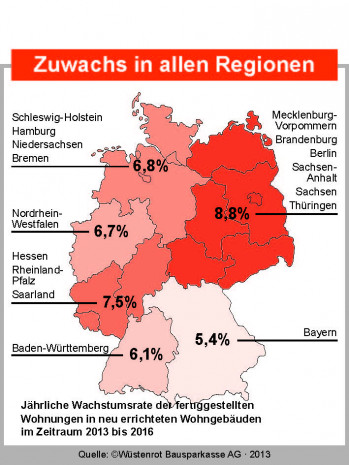 Nach schwachen Jahren befindet sich der Wohnungsbau in Deutschland in einem kräftigen und anhaltenden Aufschwung. Dadurch, so eine Studie des Ifo-Instituts im Auftrag der Wüstenrot Bausparkasse, komme es auch zu eine Entspannung auf dem Wohnungsmarkt.Die Erholung des deutschen Wohnungsbaus, die seit 2010 zu beobachten ist, wird sich nach Prognose der Experten in den nächsten vier Jahren fortsetzen. Die hohe Wachstumsdynamik von 2011 und 2012 mit einer zweistelligen Steigerungsrate der Wohnungsfertigstellungen schwäche sich allerdings leicht auf durchschnittlich knapp sieben Prozent pro Jahr im Zeitraum bis 2016 ab. Für das Jahr 2016 ist die Fertigstellung von rund 246.000 Wohnungen in neu errichteten Wohngebäuden prognostiziert, was einer Steigerung um über 80 Prozent gegenüber dem Tiefstand im Jahr 2009 mit knapp 136.000 Einheiten entspricht.Für den Zeitraum bis 2016 haben die Experten ermittelt, dass insgesamt von der Errichtung von rund einer Million neuer Wohnungen ausgegangen werden kann, einschließlich fertig gestellter Wohnungen in neu errichteten Nichtwohngebäuden und in bestehenden Gebäuden. Dazu Bernd Hertweck, Vorstand der Wüstenrot Bausparkasse: „Bei dieser Größenordnung ist in den kommenden Jahren mit einer deutlichen Entspannung an den Wohnungsmärkten zu rechnen.“Die größte relative Zunahme wird im Segment der Mehrfamilienhäuser erwartet, in dem der Neubau mit 106.000 Fertigstellungen im Jahr 2016 um 65 Prozent höher liegen soll als 2011. Die größte absolute Steigerung wird allerdings bei Ein- und Zweifamilienhäusern erwartet. Mit prognostizierten 140.000 Fertigstellungen im Jahr 2016 würde das Ergebnis aus dem Jahr 2011 um 43.000 Einheiten übertroffen. Dies entspricht eine Zunahme um 44 Prozent.Nach den Vorhersagen der ifo-Experten dürfte das deutlich erhöhte Angebot neuer Wohnungen überwiegend dort realisiert werden, wo die Engpässe heute bereits am deutlichsten spürbar sind. Die Gefahr, dass am Bedarf „vorbeigebaut“ wird, wie es teilweise im abschreibungsbedingten Boom der 90er-Jahre geschah, dürfte in den kommenden Jahren kaum bestehen.Die Wohnungsbaustudie unterteilt Deutschland diesbezüglich in sechs Großregionen (siehe Grafik). Für alle Großregionen sagen die Experten einen Aufwärtstrend bei den Wohnungsfertigstellungen voraus, allerdings mit unterschiedlicher Dynamik. Die größte relative Steigerung bei den Baufertigstellungszahlen in neu errichteten Wohngebäuden wird für die Großregion Ostdeutschland prognostiziert. Hier sollten 2016…