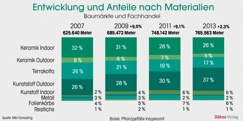 Seit einigen Jahren gehören Pflanzgefäße zur Stütze des Gartengeschäftes. Davon profitieren insbesondere die großflächigen Gartencenter der Bau- und Heimwerkermärkte und des Fachhandels. Sie haben immer mehr Regal-, Bodenflächen und Palettenplätze für Pflanzgefäße zur Verfügung gestellt. Das Angebot ist vielseitig und umfasst neben Terrakotta, keramischer Ware und Kunststoffgefäßen auch Metallgefäße, Folienkörbe sowie Pflanzgefäße aus Beton, Terrazzo, Holz und anderen Materialien. Neben einheimischer Ware spielen Importe aus Südeuropa und Fernost eine bedeutende Rolle. Der Markt entwickelt sich dynamisch, sowohl hinsichtlich der Anteile nach Materialien als auch nach Lieferanten. Auch in diesem Markt verschieben sich die Gewichte. Die "Kontaktstreckenuntersuchung Pflanzgefäße" von M&I Consulting zeichnet die Entwicklungslinien nach - und das bereits seit fast zehn Jahren. Aus den vorausgehenden Untersuchungen in den Jahren 2004, 2007, 2009 und 2011 lassen sich dazu gesicherte Erkenntnisse ableiten. Die neue Untersuchung 2013 zeigt, welche Veränderungen in den letzten beiden Jahren stattgefunden haben. Die M&I Kontaktstreckenuntersuchung ermittelt ihre Ergebnisse durch Begehung einer repräsentativen Stichprobe von Bau- und Heimwerkermärkten sowie von Gartencentern der Filialisten und selbständigen Marktbetreiber und führt dort eine Erhebung der Untersuchungsmerkmale durch. Die Stichprobe ist so ausgewählt, dass sie alle wesentlichen Gruppen im Handel einschließt und entsprechend ihrer Bedeutung berücksichtigt. Untersuchungsgegenstand ist der Handel in Gesamtdeutschland. Durch Erfassung der Gartencenter der Bau- und Heimwerkermärkte und des Facheinzelhandels wird eine repräsentative Abdeckung des Marktes erreicht, versichert Peter Hänsel von M&I Consulting. Für die repräsentierten 2.438 Gartencenter der Bau- und Heimwerkermärkte und der Gartencenter des Fachhandels wurde eine gesamte Kontaktstrecke von 765.563 lfd. m errechnet. Dies entspricht einer Steigerung von 2,3 Prozent gegenüber 2011. Der Anstieg kommt ausschließlich aus dem Fachhandel (plus 8,5 Prozent) und ist auf die Zunahme bei Vollsortimentern zurückzuführen. Pflanzgefäße haben daher erneut vom Wachstum der Anzahl Gartencenter des Fachhandels profitiert. Die im Fachhandel erfassten Gartencenter der Filialisten und Kooperationen haben damit ihren Anteil an der gesamten Kontaktstrecke von 35 auf 38 Prozent gesteigert. Dagegen ergab sich für die Gartencenter der Bau- und Heimwerkermärkte…