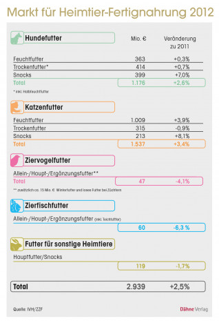 Der deutsche Heimtiermarkt hat nach einem geringfügigen Umsatzrückgang um 0,2 Prozent im Jahr 2011 wieder auf seinen Wachstumskurs zurückgefunden. Dabei ist der Gesamtumsatz 2012 um 2,2 Prozent auf 3,867 Mrd. € gestiegen. Der Markt für Heimtier-Fertignahrung übertraf das Ergebnis aus 2011 noch ein wenig deutlicher und stieg um 2,5 Prozent auf 2,939 Mrd. €. Diese Marktdaten gaben der Industrieverband Heimtierbedarf (IVH) und der Zentralverband Zoologischer Fachbetriebe (ZZF) bekannt. Der Markt für Heimtierbedarf und Zubehör erzielte 2012 einen Gesamtumsatz von 928 Mio. € und erreichte damit ebenfalls eine Steigerung von 1,3 Prozent im Vergleich zum Vorjahr.Markt für Hunde- und Katzennahrung wächstDer Markt für Katzenfutter wuchs auch 2012 weiter und erreichte einen Umsatz von 1,537 Mrd. €, ein Plus von 3,4 Prozent gegenüber 2011. Das Segment Snacks erwies sich dabei wieder einmal als Wachstumstreiber und erzielte das beste Ergebnis: Mit einem Plus von 8,1 Prozent übertraf die Sparte erneut das gute Vorjahresergebnis mit jetzt 213 Mio. €. Der Bereich Feuchtfutter verzeichnete eine Umsatzsteigerung auf 1,009 Mrd. €, ein Plus von 3,9 Prozent. Lediglich das Segment Trockenfutter musste erneut einen Rückgang von 0,9 Prozent auf jetzt 315 Mio. € hinnehmen. "Die positive Entwicklung kann vor allem mit der gestiegenen Nachfrage nach den etwas teureren Einzelportionen begründet werden", sagt der Präsident des ZZF, Norbert Holthenrich. "Im Bereich Katze entwickeln sich derzeit im Zoofachhandel besonders die Umsätze von Produkten positiv, die einen Zusatznutzen versprechen."Der Hundenahrungsmarkt setzte 2012 insgesamt 1,176 Mrd. € um und zeigte mit einem Plus von 2,6 Prozent ein höheres Wachstum als in den Vorjahren. Ausgesprochen positiv entwickelte sich mit einem Zuwachs von sieben Prozent auf 399 Mio. € wie auch im Segment Katze der Bereich Snacks. Aber auch der Bereich Feuchtfutter behauptete sich 2012 mit einem Wachstum von 0,3 Prozent auf 363 Mio. €. Das Segment Trockenfutter verzeichnete seit vielen Jahren erstmals ebenfalls wieder ein Plus und wuchs um 0,7 Prozent auf 414 Mio. €. Trotz eines Rückgangs von 1,7 Prozent auf 119 Mio. € 2012, bleibt das Segment Kleintierfutter die drittstärkste Kraft in der Tiernahrung hinter Katzen- und Hundefutter.Der Markt für Zierfisch- und Ziervogelfutter ist rückläufigDas Segment Zierfischfutter konnte den Umsatzzuwachs von 2011 nicht halten und verzeichnete 2012 wieder einen deutlichen Umsatzrückgang von 6,3 Prozent auf 60…