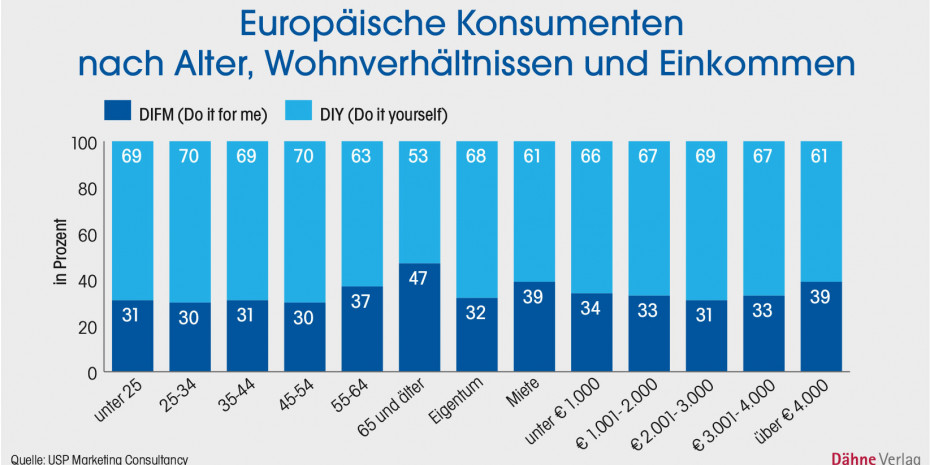 Beim Stichwort "demografischer Wandel" denkt man in der Baubranche vor allem an zukünftige Probleme: Sei es an Fachkräftenachwuchs (da weniger Junge), sei es an Engpässe beim barrierefrei gestalteten Wohnungsbestand (da mehr Alte). Doch eine neue europaweite Studie stellt den professionellen Bauhandwerkern endlich einmal auch positive Effekte der Bevölkerungsalterung in Aussicht: Der, so die Pressemitteilung, "verhasste Heimwerkermarkt" dürfte schrumpfen, wenn die künftig überwiegend älteren Bauherren und Modernisierer weniger selbst mit anpacken können.Wird aus dem Heimwerker-Schlachtruf "Do it yourself" also bald die Bauherren-Bitte "Do it for me"? Diese Hypothese sieht die USP Marketing Consultancy jedoch anhand ihrer 13-Länder-Studie "Europäischer Heimwerker- und Renovierungsmonitor" auf eine solide Datenbasis gestellt.Die demografischen Fakten: Die Alterung der europäischen Bevölkerung schreitet voran. Derzeit sind 17,5 Prozent der Gesamtbevölkerung in Europa in der Altersgruppe von 65 Jahren und älter. Schon 2020 wird der Anteil dieser Altersgruppe die 20 Prozent-Marke überschreiten und in den kommenden Jahrzehnten werden die Senioren einen immer größeren Teil der Gesamtpopulation einnehmen. Die Ergebnisse der Befragung unter 12.000 europäischen Heimwerkern im Jahr 2013 sprächen, so die Auftraggeber, eine deutliche Sprache: In der Altersgruppe 65+ gibt es deutlich mehr Konsumenten, die Arbeiten von Profis ausführen lassen. Der Anteil solcher "Do-it-for-me" (DIFM)-Aufträge ist bei dieser Gruppe mit 47 Prozent deutlich größer als bei den jüngeren (im Schnitt: 30 Prozent). Auch bei den finanziell besser Betuchten ist der Anteil der "Do-it-yourself" (DIY)-ler, die selbst anpacken, niedriger als bei den geringer Verdienenden, d. h. (zumindest derzeit noch) jüngeren Arbeitnehmern, die jeden Cent umdrehen müssen.Der wachsende Anteil der "Golden-Ager", also der eigentlichen Zielgruppe für DIFM in der Bevölkerung, bringt mit sich, dass auch in klassischen DIY-Segmenten der Bedarf durch professionelle Hilfe wachsen dürfte. Ein Markt, den, so das Beratungsunternehmen, das Handwerk nicht der Schwarzarbeit überlassen sollte. Auch Hersteller und Händler, die auch im Endkundensegment tätig sind, sollten diesen Trend nicht verpassen. Auch in Deutschland sind schon vereinzelte Beispiele bekannt: Einige wenige Händler (weniger DIY als Fachhandel) bieten den Endkunden bereits einen Handwerker-Service zur Installation von komplizierteren Produkten an (vom neuen…