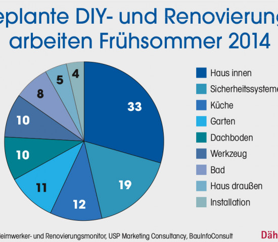 Im europäischen Heimwerker- und Renovierungsbarometer wurden im letzten Quartal 2013 insgesamt 300 deutsche Verbraucher um die Einschätzung gebeten, welche Ausgaben sie innerhalb der nächsten sechs Monate für DIY- und Renovierungsaufgaben einplanen. Ein Drittel der geplanten Investitionen sollen für Arbeiten im Haus verwendet werden. An zweiter Stelle steht der Werkzeugerwerb mit gut einem Fünftel der geplanten Ausgaben. Jeweils knapp jede zehnte Anschaffung soll für saisonbedingte Arbeiten am Hausäußeren und im Garten verwendet werden.