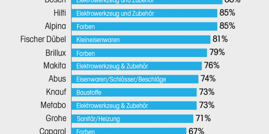 Bekanntheitspotenziale, die nicht mit Sympathie aufgeladen sind, lassen sich nur schwer zum Kauf motivieren. Unsere Spitzenreiter lauten: Hilti (Elektrowerkzeug), Bosch (Elektrowerkzeug), Makita (Elektrowerkzeug), Würth, Alpina, Abus, Fischer Dübel, Metabo, Brillux und Knauf. Der durchschnittliche Anteil…