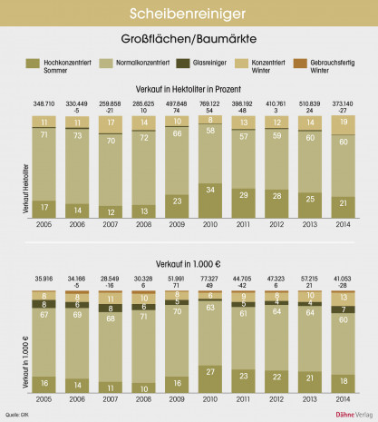 Eine Auffälligkeit zeigt sich im Vergleich des Gesamtmarktes mit dem Baumarkt-Sektor: Nicht-Mikroprozessor gesteuerte Geräte verkaufen sich über Baumärkte besser. Eine zweite Produktgruppe, die hier betrachtet werden soll, sind die Scheibenreinigungsmittel. Hier zeigt sich, dass die Ready-to-use-Produkte, also die gebrauchsfertigen Produkte, in den letzten zehn Jahren sich einen ordentlichen Marktanteil erobern konnten. Lag deren Anteil, gemessen an abgesetzten Hektolitern, 2005 bei 17 Prozent am Gesamtmarkt, stieg dieser bis 2010 auf 34 Prozent. Allerdings schwächte sich dieser Markt bis 2014 wieder auf 21 Prozent ab. Berücksichtigt werden müssen hier jedoch auch die wetterbedingten Einflüsse, die sich an der abgesetzten Gesamtmenge ablesen lassen. Am anderen Ende der Skala konnten die normal konzentrierten Produkte Marktanteile gewinnen.