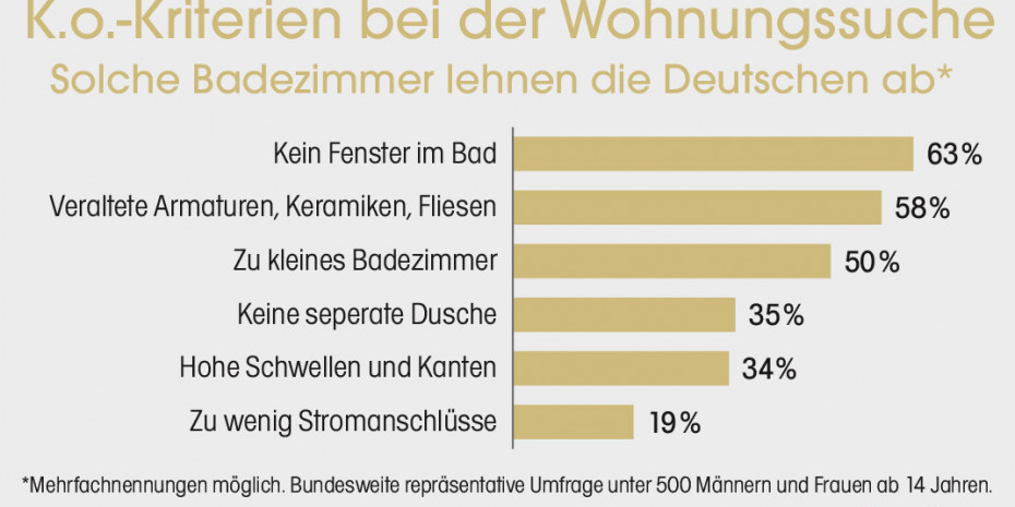 Auf Platz eins steht das fehlende Fenster mit 62,5 Prozent, gefolgt von veralteten Armaturen, Keramiken und Fliesen (58,1 Prozent). Fehlen Badewanne (31,1 Prozent) oder eine separate Dusche (34,5 Prozent) ist dies für rund ein Drittel der Deutschen ein Ausschlusskriterium für die gesamte Wohnung. Ebenso verweigert sich ein Drittel der Befragten (33,8 Prozent) hohen Schwellen und Kanten im Badezimmer. Zu wenige Stromanschlüsse im Bad stören 19,3 Prozent aller Befragten so sehr, dass sie einen Einzug ausschließen würden. Lediglich 4,6 Prozent aller Befragten geben an, dass sie kein Kriterium im Bad als Ausschlusskriterium bewerten würden.