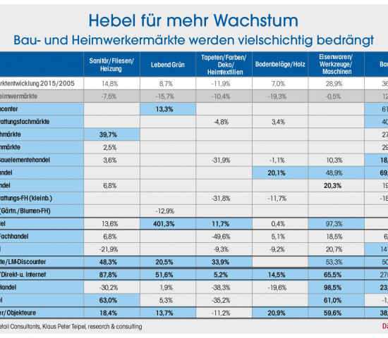 Dennoch seien die Baumärkte im Wettbewerb der Vertriebskanäle nicht auf dem Niveau früherer Zeiten, Fachhandel, Handwerk, Internet-Pure-Player und Distanzhandel setzten der Branche zu. Aktuelle Konzepte ließen eine adäquate Teilhabe an der Marktentwicklung nicht zu. Zukünftige Wachstumshebel sieht Teipel in der Optimierung bestehender Verkaufsflächen und -konzepte. Kleinflächenkonzepte etwa böten starke Wachstumspotenziale und seien daher bereits im Fokus zahlreicher Marktakteure.