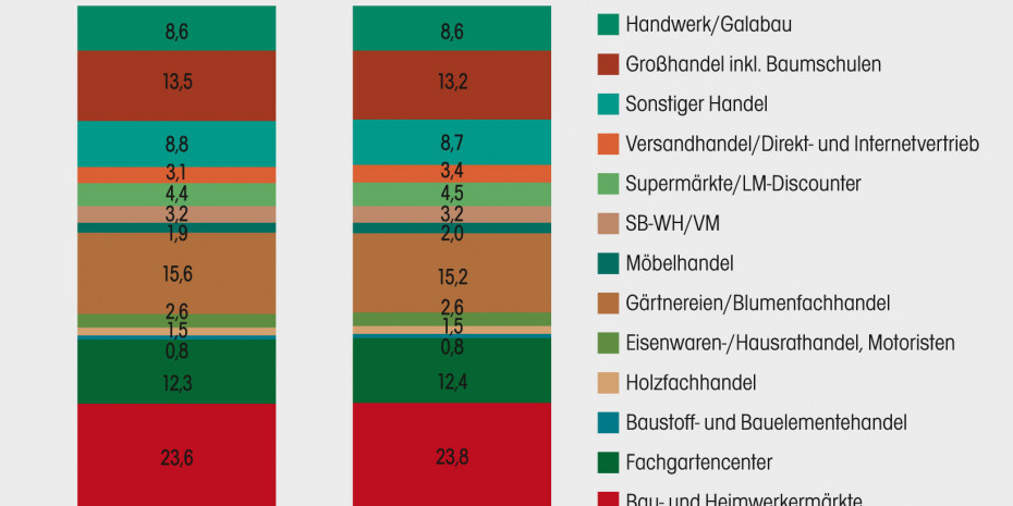 Aber es gab 2015 nur zwei Kanäle mit einem zweistelligen Wachstum. Der andere ist der E-Commerce - "selbstverständlich", meint man zunächst, aber hier geht das Wachstumstempo zurück. Im vergangenen Jahr wurden rund 597 Mio. € mit Gartensortimenten online umgesetzt. Das waren 13,6 Prozent mehr als im Vorjahr.