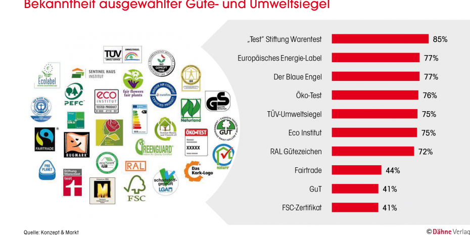 Über einigermaßen nennenswerte Bekanntheitswerte verfügen noch "Fairtrade" (44 Prozent), "GuT" (41 Prozent), "FSC-Zertifikat" (41 Prozent) und "IBR" (32 Prozent). Alle anderen Label erreichen lediglich eine gestützte Bekanntheit von unter 20 Prozent. Dabei wurde nicht die Frage gestellt, was die einzelnen Labels eigentlich bedeuten.