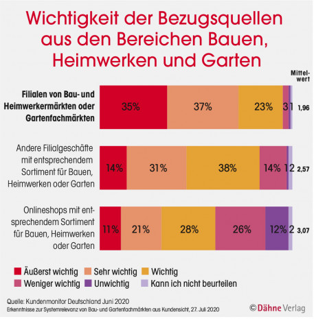 Auffallend ist die große Bedeutung, die Kunden den Bau- und Gartenfachmärkten zubilligen: 35 Prozent sind sie „äußerst wichtig“, 37 Prozent „sehr wichtig“ und 23 Prozent „wichtig“, was zu einer „Wichtigkeitsquote“ von sagenhaften 95 Prozent führt. Spannend ist, dass zwei Drittel der DIY-affinen Kunden angibt, Bau- und Gartenfachmärkte aufgrund der sofortigen Produktverfügbarkeit zu benötigen.