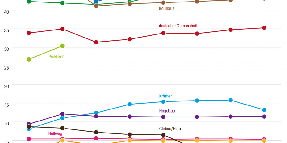 Weitere Unternehmen mit Deutschland- und Auslandsgeschäft waren zuletzt Krämer, Hagebau, Hellweg, Eurobaustoff und Globus/Hela. Dabei zeigte sich, dass bei keinem der genannten Unternehmen der Auslandsanteil am Umsatz 2019 zugenommen hat. Stattdessen hat dieser bei Krämer auf 13,2, bei Hellweg auf 5,3 und bei Globus/Hela auf 2,2 Prozent abgenommen. Bei der Hagebau sowie der Eurobaustoff ist der Anteil 2019 konstant geblieben.