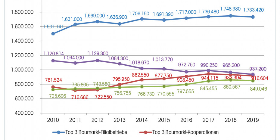 Einbezogen in den Vergleich wurden zum Zeitpunkt Ende 2019 bei den Baumarkt-Filialbetrieben 742 (Vorjahr 749) Standorte der Betreiber Bauhaus, Obi und Toom; bei den Baumarkt-Kooperation 575 (Vorjahr: 562) Standorte der Betreiber Bauvista, Eurobaustoff und Hagebau; bei den Garten-Filialisten 163 (Vorjahr: 166) Standorte der Betreiber Dehner, Pflanzen-Kölle und Blumen Risse sowie 822 (Vorjahr: 820) Standorte der Garten-Kooperationen Egesa-Zookauf, Sagaflor und Ekaflor.