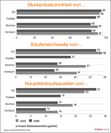 In der Zusammenfassung des Berichts für 2020 heißt es: „Die stärkste Marke Obi ist auch die bekannteste und wird von 93 Prozent der befragten Baumarktkäufer gestützt erinnert. Mit jeweils 91 Prozent folgen Bauhaus und Hornbach. Allen drei Marken ist gemein, dass sie relativ stark im TV beworben werden. … Die Käuferreichweite korrespondiert im Wesentlichen mit der Markenbekanntheit. Obi ist nicht nur der bekannteste Baumarkt, sondern hat mit 58 Prozent auch die höchste Käuferreichweite. Es folgen Bauhaus mit 47 Prozent sowie Hornbach und Toom mit jeweils 41 Prozent. … Im Hinblick auf die Haupteinkaufsquelle setzten sich klar fünf Anbieter ab, nämlich Obi (23%), Bauhaus (19%), Hornbach und Toom (jeweils 14%), sowie Hagebau (11%).“