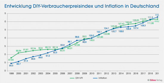Um den Preisindex – man könnte ihn „DIY-VPI-Index“ nennen – zu erstellen, wurde aus der Datenbank des Statistischen Bundesamtes die Preisentwicklung für 59 verschiedene Warenkategorien, von Tapeten über Farben, Gartenschirme, Schlagbohrer, Regale, Hundefutter und Nägel bis zu Autobatterien, für die Jahre von 1999 bis 2019 ein Durchschnittswert gebildet. Dieser Index ist nicht deckungsgleich mit dem allgemeinen Verbraucherpreisindex, der identisch der offiziellen Inflationsrate ist, beschreibt jedoch die Entwicklung im DIY-Bereich genauer und hat sich in den vergangenen 21 Jahren ähnlich der Inflation entwickelt (siehe Grafik 2). Bemerkenswert ist dabei, dass die Preisentwicklung im DIY-Bereich 2019 erstmals seit 2007 und 2008 unterhalb der Inflation lag.