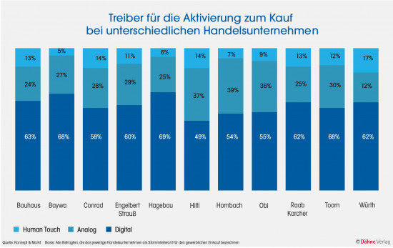 Mit Ausnahme der Einkaufsgenossenschaften haben für die Nutzung aller übrigen Handelskanäle digitale Medien einen stärkeren Einfluss als die Offline-Medien. Mit Ausnahme von Würth ist die Rolle des Human Touch eher gering, was im Prinzip auch der Nutzungsintensität geschuldet ist. Nicht bei jeder Nutzung eines bestimmten Vertriebskanals erfolgt ein persönlicher Kontakt mit Mitarbeitern in der Beratung. Die Treiberwirkungen der Touchpoints sind je nach Einkaufskanal sehr unterschiedlich. Die jeweils wichtigsten sind: