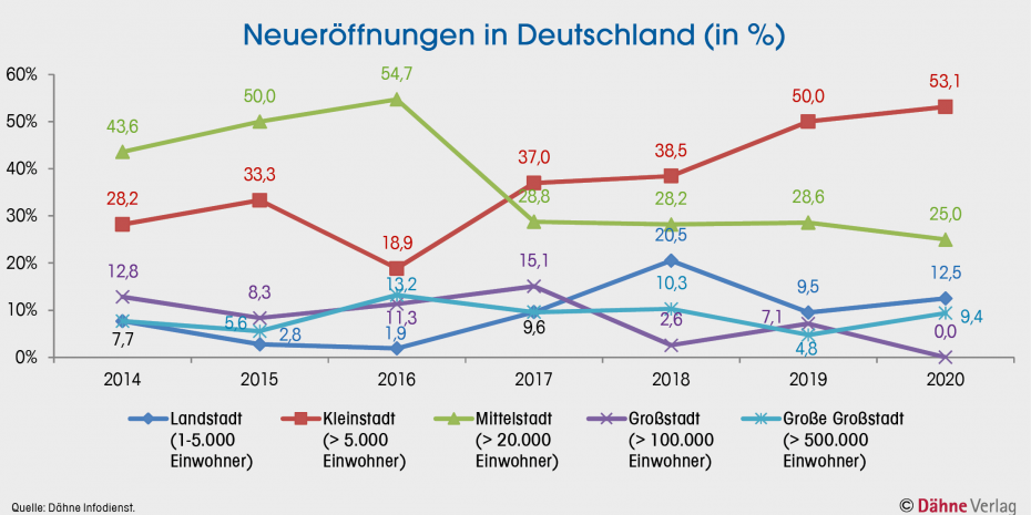 Gleichzeitig ging 2020 – ähnlich wie im Vorjahr – entsprechend die Anzahl der Neueröffnungen in Städten mit mehr als 20.000 Einwohnern auf nur noch 34,4 Prozent zurück: 25 Prozent aller Neueröffnungen fanden 2020 Jahr in Mittelstädten (20.001 – 100.000 Einwohner), 0 Prozent in Großstädten (100.001 – 500.000 Einwohner) und 9,4 Prozent in großen Großstädten (mehr als 500.000 Einwohner) statt. Zusehends weniger Neueröffnungen finden seit einem Zwischenhoch 2016 in Mittelstädten (20.001 – 100.000 Einwohner) statt.