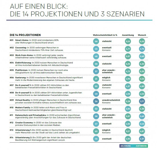 Nach Meinung der Befragten ändert sich die elementare Bedeutung des Zuhauses trotz erheblicher Umwelteinflüsse bis 2030 nicht maßgeblich. In einer gefühlt unsicher werdenden Welt werde es ein Rückzugsort sein, ein Refugium, in dem die Bewohner vielfältige Aktivitäten entfalten können. Eine hohe Übereinstimmung bestand darin, dass das Zuhause ein Zugehörigkeitsgefühl vermitteln und ihm eine hohe Bedeutung im Ausdruck der eigenen Ideen und Werte zukommen wird.