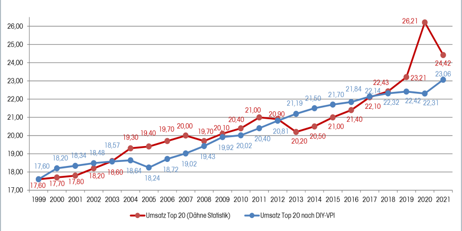 In der Grafik sind die Brutto-Umsätze der Top 20 Baumarktbetreiber nach Dähne Statistik einer reinen Fortschreibung der Umsätze auf Grundlage der Umsatzzahlen von 1999 und der seitdem wirkenden Preisentwicklung im DIY-Bereich (s. blaue Linie in Grafik, „Umsatz Top 20 nach DIY-VPI“) gegenübergestellt. Grundlage dieser Betrachtung ist die fiktive Annahme, dass die Anzahl der verkauften Waren seit 1999 gleichgeblieben ist. Laut dieser hätte der Umsatz zu Ende 2021 bei 23,06 Mrd. Euro liegen müssen – 1,36 Mrd. Euro unter der realen Entwicklung.