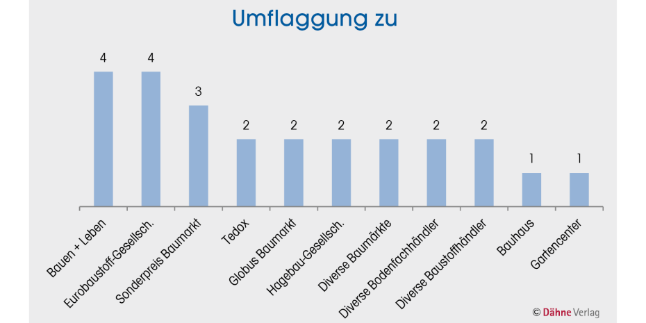 Während 2020 Bauhaus sich am stärksten bediente und sich fünf Standorte einverleibte, wechselten 2021 die meisten Standorte zum Franchise-System Bauen+Leben (4 Standorte) oder zur Eurobaustoff und einer ihr angeschlossenen Vertriebslinien (4 Standorte). Hinter den Umflaggungen zu „Diversen Baumärkten“ stecken ein Raiffeisen Bau- und Gartenmarkt sowie ein Tink-Markt, hinter den „Diversen Bodenfachhändlern“ ein Bodenhaus- und ein Laminat Depot-Markt.