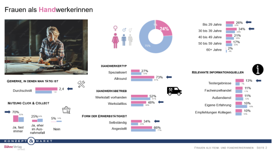 Konzept & Markt publiziert gemeinsam mit dem diy-Fachmagazin regelmäßig Studien zum Einkaufs- und Informationsverhalten bei Heimwerkerinnen und Heimwerkern sowie Handwerkerinnen und Handwerkern. Insofern liegt ein umfassender und repräsentativer Datenfundus über die Unterschiede von verschiedenen Nutzergruppen vor, darunter auch die Geschlechter betreffend.