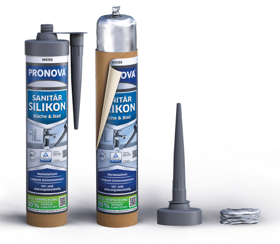Im Gegensatz zur klassischen Plastikkartusche kann die Papphülse von Pronova zu 100 Prozent recycelt werden. Denn das eigentliche Produkt, der jeweilige Dicht- oder Klebstoff steckt in einem hauchdünnen Schlauchbeutel, der nach Verbrauch seines Inhalts zusammen mit der Kappe und Spitze als Restmüll entsorgt werden kann. Der Anteil der Verpackung, der nicht recycelt werden kann, wird so minimiert.
