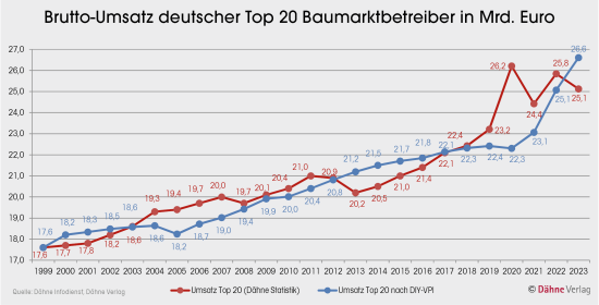 2023 war ein außergewöhnlich schlechtes Jahr für die Baumarktbranche in Deutschland, stellt man die Umsätze der langfristigen Entwicklung der Verbraucherpreise im DIY-Bereich gegenüber: Während die Umsätze (brutto) der Top 20 Baumarktbetreiber in Deutschland 2023 insgesamt um 2,9 Prozent zurückgegangen sind, stiegen die Verbraucherpreise für Güter des DIY-Handels („DIY-VPI“) in Deutschland im Durchschnitt um rund 6,12 Prozent an (s. Grafik). Gegenüber einer fiktiven Fortschreibung der Umsätze, basierend rein auf der Entwicklung der DIY-Verbraucherpreise seit 1999, entstand so zu Ende 2023 ein Minus von rund 1,48 Mrd. Euro. Dieses lag knapp 50 Prozent über den letzten Minusrekorden von 2013 und 2014 mit je rund 1,0 Mrd. Euro. Damals war in Folge der Praktikerpleite der drittgrößte Betreiber in Deutschland (Umsatz 2012: 2,6 Mrd. Euro) verschwunden und der Gesamtmarkt darauf hin für mehrere Jahre eingebrochen.