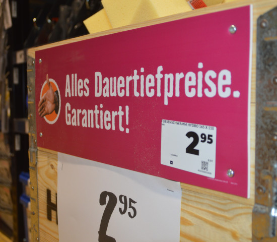 Ganz an Hornbach-Prinzipien orientiert sich die Preisgestaltung: Sehr auffällig wird im Markt auf die Dauertiefpreise hingewiesen („Keine Aktionspreise. Immer günstig“), es gibt lediglich einige als „Sondereinkauf“ gekennzeichnete Artikel in einem dafür vorgesehenen Gang.