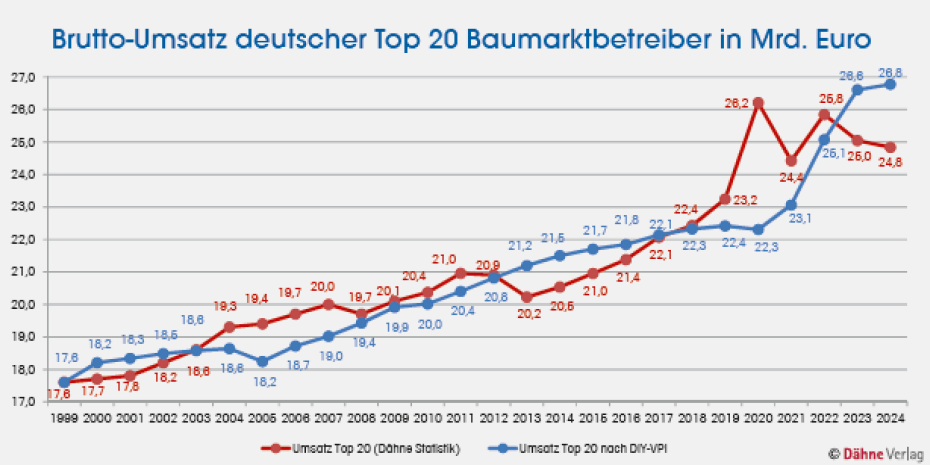 Demnach sind die Umsätze (brutto) der Top 20 Baumarktbetreiber in Deutschland 2024 insgesamt um 0,84 Prozent auf rund 24,8 Mrd. Euro zurückgegangen. Gleichzeitig stiegen die Verbraucherpreise für Güter des DIY-Handels („DIY-VPI“) in Deutschland im Durchschnitt um rund 0,63 Prozent an. Das Besondere hierbei: Mit nur 0,63 Prozent stiegen die Preise im Bau- und Gartenbereich nur etwas mehr als ein Viertel so stark wie die allgemeine Inflation mit 2,2 Prozent, jeweils laut statistischem Bundesamt (Destatis). Im historischen Vergleich der Entwicklung zwischen DIY-Verbraucherpreisen und allgemeinen Verbraucherpreisen war dies der zweitniedrigste Preisauftrieb im DIY-Bereich der letzten 25 Jahre – nur übertroffen vom Jahr 2005, als die Inflation bei 1,4 Prozent lag, während der DIY-VPI um 1,9 Prozent zurückging. Die unterschiedliche Preisentwicklung deutet darauf hin, dass die Baumarktbranche 2024 im Vergleich zur allgemein bereits schwachen wirtschaftlichen Entwicklung in Deutschland eine besondere Konjunkturschwäche erlebte.