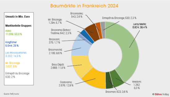 Der französische DIY-Markt ist hochgradig konzentriert. Die vier größten Baumarktgruppten stehen zusammen für 97,5 Prozent des Marktes. Noch dominanter fällt die Position des Marktführers Leroy Merlin aus – er hat einen Marktanteil von 40 Prozent. Die beiden Vertriebslinien Bricoman und Weldom eingerechnet, entfällt auf den Mutterkonzern Adeo die Hälfte des Baumarktumsatzes in Frankreich. Auf nur ein Viertel kommt Kingfisher mit den Ketten Castorama und Brico Dépôt. Das verbleibende Viertel teilen sich die Gruppen Les Mousquetaires und Mr. Bricolage ungleich untereinander auf.