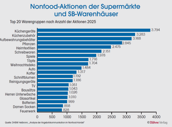 Professor Carsten Kortum von der Dualen Hochschule Baden-Württemberg, Heilbronn, und Martin Langhauser von Marktguru Deutschland haben sich das genauer angesehen und ihre Erkenntnisse in einem Whitepaper mit dem Titel „Analyse der Angebotskommunikation im Nonfood-Handel“ vorgelegt. Ihre empirische Studie belegt einen „deutlichen strategischen Bedeutungszuwachs von Nonfood-Aktionen im deutschen Einzelhandel“, wie sie schreiben. Untersucht haben sie die Jahre 2023 bis 2025.
