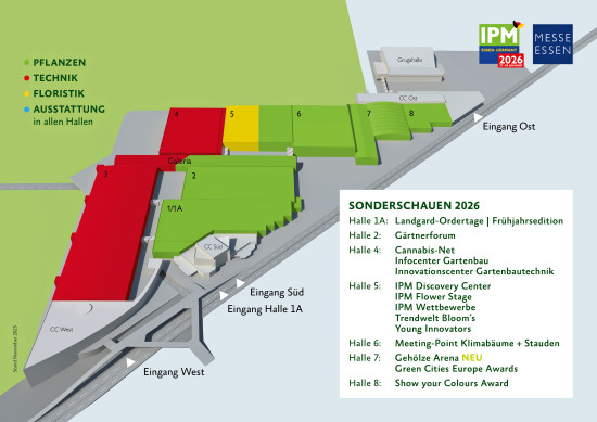 Auch 2026 belegt die IPM Essen das gesamte Messegelände. Die Hallen sind klar nach Themen gegliedert und bieten Fachbesuchern eine präzise Orientierung. Die einzige Ausnahme: Ausstattung für Gartenbaubetriebe, vom Ladenbau bis zur IT, von Etiketten über Verpackung bis zu Dekoration und Marketing sind in allen Messehallen integriert – thematisch passend zu den jeweiligen Bereichen.