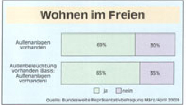 Danach haben 69 Prozent der Deutschen einen Garten, Balkon oder eine Terrasse. Dabei spielt auch die Beleuchtung eine große Rolle. In 65 Prozent der Außenanlagen sind danach auch Außenbeleuchtungen vorhanden.