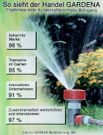 Als Topmarke im Angebotssegment Garten stuft der Handel die Gardena Holding AG, Ulm, ein. Bei einer GfK-Kundenzufriedenheitsbefragung im Auftrag des Unternehmens gaben 95 Prozent der Befragten diese Einschätzung ab. Als bekannte Marke sehen 98 Prozent Gardena, die Zusammenarbeit weiterführen und intensivieren wollen 97 Prozent. Als innovatives Unternehmen beurteilen 91 Prozent der Befragten den Anbieter. Die partnerschaftliche Zusammenarbeit wird von 83 Prozent hoch bewertet. Von Gardena wird dieses Ergebnis als Spiegelbild kompetenter Verkaufsberatung vor Ort, intensiver Servicecenter-Aktivitäten und qualifizierter Neuheitenschulungen zum Saisonstart gesehen.