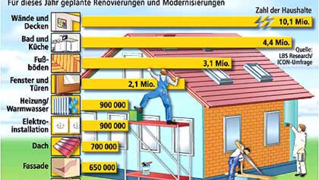 Annähernd 70 Prozent aller Renovierungs- und Modernisierungsarbeiten an der Wohnung oder im Haus erfolgen in Eigenleistung, zum Teil unter Mithilfe von Verwandten und Freunden. Rund 20 Mio. Haushlte in Deutschland haben in den vergangenen drei Jahren mindestens eine solche Maßnahme in Angriff genommen. Das ist das Ergebnis einer repräsentativen Umfrage des Marktforschungsinstituts Icon im Auftrag der Landesbausparkassen. Und das Volk der Heimwerker werkelt auch in diesem Jahr fleißig weiter: Allein 10,1 Mio. Haushlte planen, Wände oder Decken zu verschönern, 4,4 Mio. wollen sich in Bad und Küche zu schaffen machen.