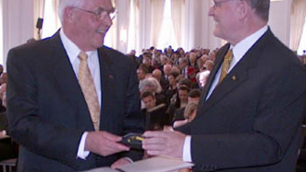 Der baden-württembergische Ministerpräsident Erwin Teufel verleiht Manfred Maus die Verdienstmedaille des Landes