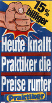 Praktiker ist das zweite Einzelhandelsunternehmen, das mit der Bildzeitung bei einer Rabattaktion im Zusammenhang mit der Teuro-Debatte kooperiert. Wer heute mit einer Bildzeitung vom Tage bei Praktiker einkauft, erhält auf einen frei wählbaren Artikel 15 Prozent Rabatt. Das gilt auch für bereits reduzierte Ware. Ausbauhäuser oder -pakete sind allerdings ausgenommen. Unter der Schlagzeile „Heute knallt Praktiker die Preise runter“ wird die Aktion auf der ersten Seite der Zeitung angekündigt. In der vergangenen Woche hatte die Warenhauskette Woolworth einen Tag lang die Preise für Bild-Leser um zehn Prozent gesenkt.