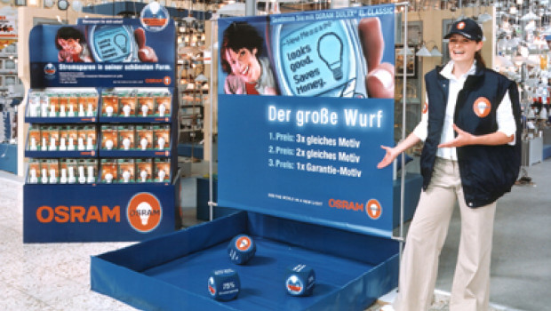 Osram hat eine Verkaufsaktion für Energiesparlampen gestartet. Bis März 2003 stehen 50 Promotor-Teams bereit, um jeweils für zwei Tage mit einem POS-Gewinnspiel unter dem Titel „Der große Wurf“ im Markt zu sein, das parallel dazu im Internet läuft. Begleitend hat das Unternehmen eine Couponing-Aktion entwickelt: Beim Kauf einer Dulux-Energiesparlampe erhält der Kunde einen Gutschein im Wert von einem €, der an der Kasse als Rabatt auf den Gesamteinkauf vergütet wird. Damit wolle man den empfohlenen Verkaufspreis unangetastet lassen und gleichzeitig dem Margenschwund entgegentreten, begründet Verkaufsleiter Karl-Heinz Pietsch den Rabatt.