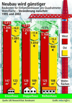 Die Baukosten für Einfamilienhäuser sind in den letzten Jahren deutlich gefallen. Das geht aus einer Analyse von Daten des Statistischen Bundesamtes aus den Jahren 1995 bis 2002 durch LBS Research hervor. In dieser Zeit sind die Preise pro Quadratmeter Wohnfläche durchschnittlich um 6,5 Prozent gesunken. Nach Ansicht der LBS-Forscher verhalten sich Bauherren einerseits zunehmend preisbewusst und sparen auch an der Ausstattung. Andererseits nutzen sie die Situation, um sich statt eines Reihenhauses ein freistehendes Einfamilienhaus zu leisten. Auf diese Bauform sind 2002 rund zwei Drittel aller Einfamilienhaus-Genehmigungen entfallen.