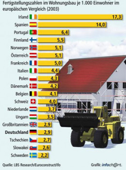 Deutschland hinkt beim Wohnungsneubau seinen europäischen Nachbarn hinterher. Während hierzulande 2003 nur 2,9 neue Wohneinheiten pro tausend Einwohner gebaut wurden, liegt der Schnitt in Westeuropa bei rund fünf Wohnungen. Spitzenreiter sind Irland mit 17,3 und Spanien mit 14,0 Neubauten pro tausend Einwohner. Darauf hat die LBS hingewiesen. Mittlerweile haben auch die größeren EU-Beitrittsländern aus Mittel- und Osteuropa den Anschluss an die Wohnungsbauentwicklung gefunden, heißt es in dem Bericht. In Polen, Ungarn, Tschechien und der Slowakei hat sich die Quote in sieben Jahren im Schnitt auf 3,3 Wohnungen verdoppelt. Nur Tschechien und die Slowakei schneiden schlechter ab als Deutschland.