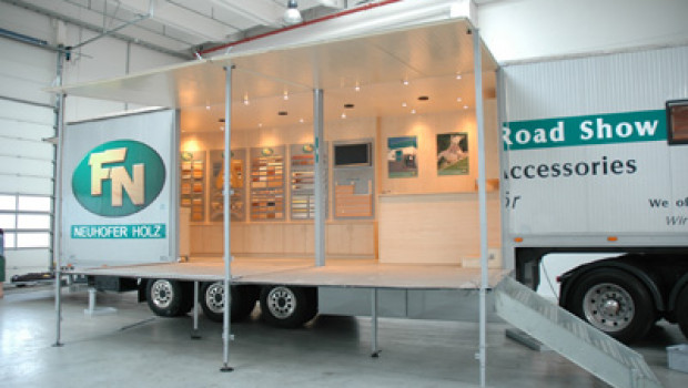 Das österreichische Unternehmen FN Neuhofer Holz, Zell am Moos, hat einen Truck ausgebaut. Das Fahrzeug (13,5 m lang, 2,5 m breit) kann in 20 Minuten in einen Messestand verwandelt werden. Vorgestellt wurde dieses Marketinginstrument am 18. Mai am Standort Zell. Im Inneren ist der Hänger zweigeteilt. An die Präsentation des Neuhofer-Sortiments schließt sich ein Besprechungsraum an. Der Truck kann von den Neuhofer-Kunden gemietet und dann bei Veranstaltungen eingesetzt werden. Gestartet wird noch im Mai in der Schweiz und Deutschland. Im September findet eine Spanientour mit bisher 15 Stationen statt.