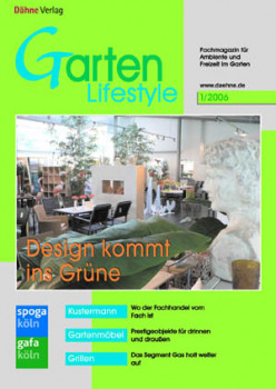 Auf der spoga+gafa hat eine neue Fachzeitschrift Premiere: Der Dähne Verlag, Ettlingen, stellt die erste Ausgabe von Garten Lifestyle vor. Das neue Fachmagazin für Ambiente und Freizeit im Garten richtet sich an Leser aus Industrie und Handel. Es berichtet über Branchen und Sortimente, die das Leben im Garten schöner machen: Möbel für Garten, Terrasse und Balkon, Gartendekoration, Freizeit im Garten, Kochen im Freien, Licht und Wasser im Garten. Im Handelsteil geht es dabei um die relevanten Vertriebskanäle wie Bau- und Heimwerkermärkte, Gartencenter, Verkaufsgärtnereien, Gartenmöbel-Fachhandel, Holzfachmärkte, Einrichtungs- und Möbelhäuser, Haushaltswarengeschäfte mit Gartenausrichtung und Trendshops. Ein umfangreiches Herstellerressort bringt ausführliche Firmenportraits und Produktneuheiten. Weitere Themen sind Marktanalysen, Fachmessen, Logistik, Marketing und Dienstleistungen rund um den Sortimentsbereich.
