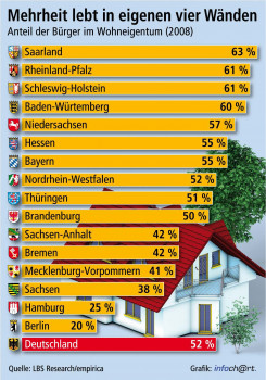 Mit 52 Prozent stellen Wohneigentümer die absolute Mehrheit in Deutschland. Dies zeigt eine Analyse der aktuellsten statistischen Daten für 2008 durch das Forschungsinstitut empirica im Auftrag der Landesbausparkassen (LBS). Beim Vergleich der Bundesländer liegt das Saarland mit einer Eigentümerquote von 63 Prozent an der Spitze. In Hamburg und Berlin lebt dagegen nur einer von vier bzw. fünf Einwohnern in den eigenen vier Wänden. Bei der Analyse nach Bundesländern zeigt sich, dass in keinem "alten" Flächenstaat die Mieter noch in der Überzahl sind. Auch in Nordrhein-Westfalen - einem Land mit traditionell großem Mietwohnungsbestand - hat die Wohneigentumsquote 2008 den bundesdeutschen Durchschnittswert von 52 Prozent erreicht. Der Südwesten (Saarland, Rheinland-Pfalz, Hessen) kommt genauso wie der Norden (Schleswig-Holstein, Niedersachsen) und der Süden (Baden-Württemberg, Bayern) sogar ausnahmslos auf Wohneigentumsquoten von 55 Prozent und mehr. In Thüringen und Brandenburg hat die Wohneigentumsquote bereits die 50-Prozent-Marke erreicht hat. In den drei anderen neuen Ländern ist dagegen der Aufholprozess noch nicht so weit vorangekommen; hier werden Werte von 38 bis 42 Prozent registriert. Groß sind die Unterschiede nach wie vor in den Stadtstaaten: In Bremen leben mit 42 Prozent mehr als doppelt so viele Einwohner in den eigenen vier Wänden (ob im Eigenheim oder in einer Eigentumswohnung) wie im Falle des Schlusslichts Berlin.