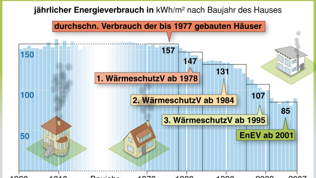 Der Energieverbrauch von Gebäuden hat sich in den zurückliegenden drei Jahrzehnten fast halbiert. Häuser, die vor 1978 gebaut wurden, benötigen pro Jahr im Durchschnitt 157 kWh/m² Wohnfläche. Dagegen schlagen für Gebäude, die gemäß der Energieeinsparverordnung (EnEV) 2001 gebaut wurden, nur 85 kWh zu Buche, wie eine Auswertung von 350.000 Gebäudedaten durch die Beratungsgesellschaft co2online ergeben hat. Das Unternehmen erwartet ein weiteres Absinken dieser Werte unter anderem wegen der Novellierung der EnEV im Jahr 2007 und nun ab 1. Oktober 2009. Die erste Wärmeschutzverordnung war 1978 erlassen worden.