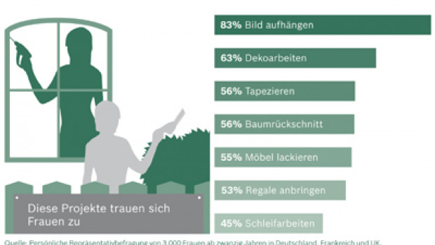 Dass Heimwerken längst auch Frauensache ist, hat sich Bosch jetzt in einer Umfrage durch die GfK in Deutschland, Frankreich und Großbritannien bestätigen lassen. Mehr als 80 Prozent der Befragten führen Arbeiten in Haus und Garten eigenständig durch, 35 Prozent von ihnen sogar oft. Besonders wichtig ist es 43 Prozent, kleine Reparaturen im Haushalt selbst erledigen zu können. Und ihr Selbstvertrauen wächst: Jede dritte Frau wagt sich auch an anspruchsvolle Projekte.