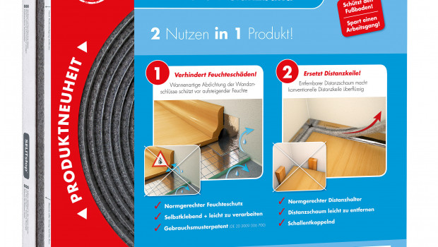 Mit dem Selit Stop Dicht- und Distanzband steht einer professionellen Verlegung von Laminatböden nichts mehr im Wege. Zum Einsatz kommt das Band im Anschlussbereich zur Wand, wo das Abdichten der Dämmunterlage zur Vermeidung von Feuchteschäden zwingend notwendig ist. Die winkelförmige Verklebung dieses Bereiches, die früher wahre „Fummelarbeit“ darstellte, geht durch das genutete selbstklebende Dichtband spielend einfach. Die Verklebung erfolgt direkt auf dem Feuchteschutz – also auf einer PE-Folie oder auf einem Kombiprodukt. Das Dicht- und Distanzband hat einen PE-Schaum-Streifen integriert. Somit kann ohne das lästige Platzieren zahlreicher Distanzkeile direkt der Boden verlegt werden.www.selit.de