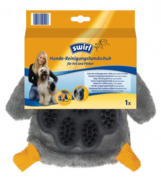Eine gründliche und zugleich schnelle Fellpflege ermöglicht der neue Hunde-Reinigungshandschuh von „Swirl“ zum Reinigen, Kämmen und Trocknen des Tieres. Die Vorderseite des Handschuhs besitzt spezielle Gumminoppen, mit denen sich grober Schmutz sanft aus dem Fell bürsten lässt. Die Rückseite aus weichem Textilgewebe nimmt die Feuchtigkeit effektiv auf. Gegen Steinchen oder Schmutz zwischen den Pfoten helfen die integrierten Pfotenreiniger, kleine Ecken aus Baumwolle, die sich wie ein Fingerhut überstülpen lassen.www.tierisch-swirl.de