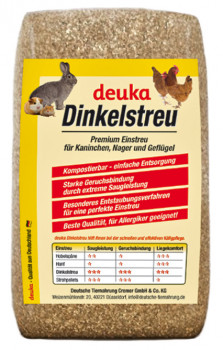 Jetzt neu: Die „Deuka-Dinkelstreu“ für Kaninchen, Nager und Geflügel, zeichnet sich durch eine extrem hohe Saugleistung in Verbindung mit einer starken Geruchsbindung aus. Ein besonderes Entstaubungsverfahren erhöht die Qualität für eine perfekte Einstreu. Da es besonders weich ist, haben die Tiere einen sehr hohen Liegekomfort. Durch die Kompostierbarkeit von „Deuka Dinkelstreu“ kann dieses Produkt einfach entsorgt werden. „Deuka Dinkelstreu“ hilft somit bei der schnellen und effektiven Käfigpflege. www.deutsche-tiernahrung.de