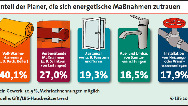 Hausbesitzer, die eine Modernisierung ihres Eigenheims planen, trauen sich als Eigenleistung am ehesten die Wärmedämmung zu. Laut einer GfK-Umfrage im Auftrag der Landesbausparkassen (LBS) haben 40 Prozent vor diesem Gewerk keine Berührungsängste. Weitere 27 Prozent wollen vorbereitende Maßnahmen wie das Schlitzen von Leitungen selbst ausführen. An den Austausch von Fenstern und Türen wagen sich 19 Prozent heran. Angesichts steigender Heizkosten will der Umfrage zufolge jeder vierte Immobilienbesitzer in den kommenden drei Jahren energetisch sanieren. Dabei bietet die Gebäudehülle das größte Einsparpotenzial. Hier ist der Modernisierungsbedarf besonders hoch: Nur 14 Prozent der über 40 Jahre alten Häuser sind komplett wärmegedämmt.