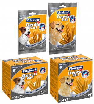 Die „Dental 2in1 Zahnpflegesticks“ von Vitakraft überzeugen durch ihre innovative „2in1“-Wirkstoffkombination „Stay Clean“. Diese reduziert das Wachstum der für die Bildung von Zahnbelag verantwortlichen Bakterien und Pyrophosphaten, bindet zusätzlich das im Speichel enthaltene Calcium und bremst damit die Neuentstehung von Zahnstein. Darüber hinaus trägt die spezielle Sternform der Sticks zur gründlichen Reinigung der Zähne bei und unterstützt die Entfernung von Zahnbelag und Zahnstein. Und das Beste: Die Sticks schmecken auch noch unwiderstehlich lecker! Hergestellt werden die Sticks nach einer zuckerfreien Rezeptur, ohne Zusatz von Antioxidantien oder künstlichen Aromen. Die „Dental 2in1 Zahnpflegesticks“ werden auch als Wochenpackung mit sieben Sticks für kleine beziehungsweise für große und mittelgroße Hunde angeboten.www.vitakraft.de